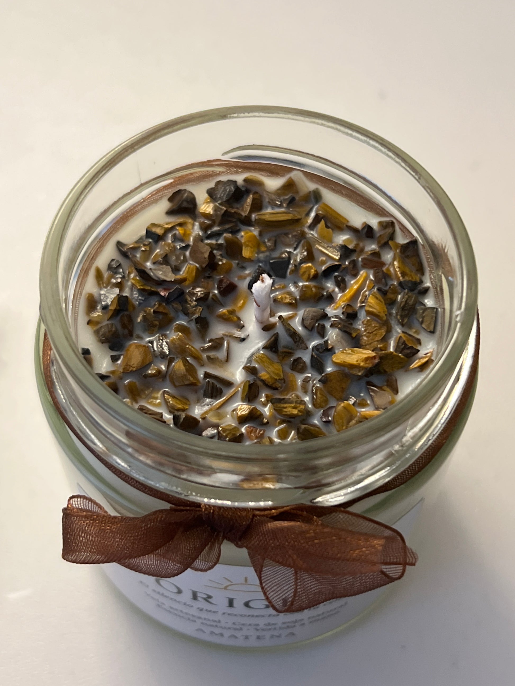 La vela ORIGEN está creada a mano, con cera de soja 100% natural, mecha de algodón y una cuidada selección de chips de Ojo de Tigre, un mineral conocido por su energía protectora y estabilizadora. Cada unidad se vierte de forma artesanal, una a una, respetando el ritmo del proceso para garantizar una combustión limpia y una experiencia sensorial única.
